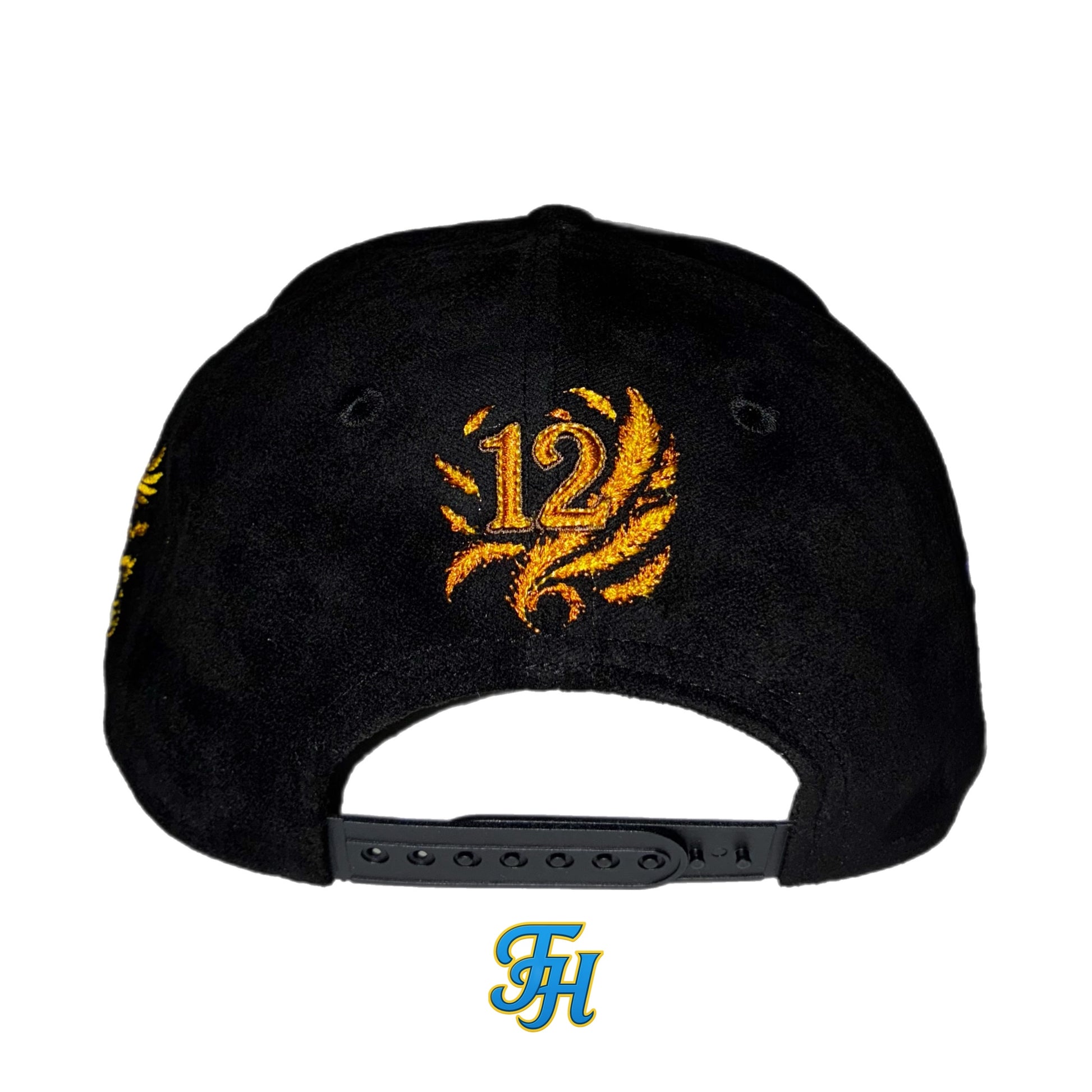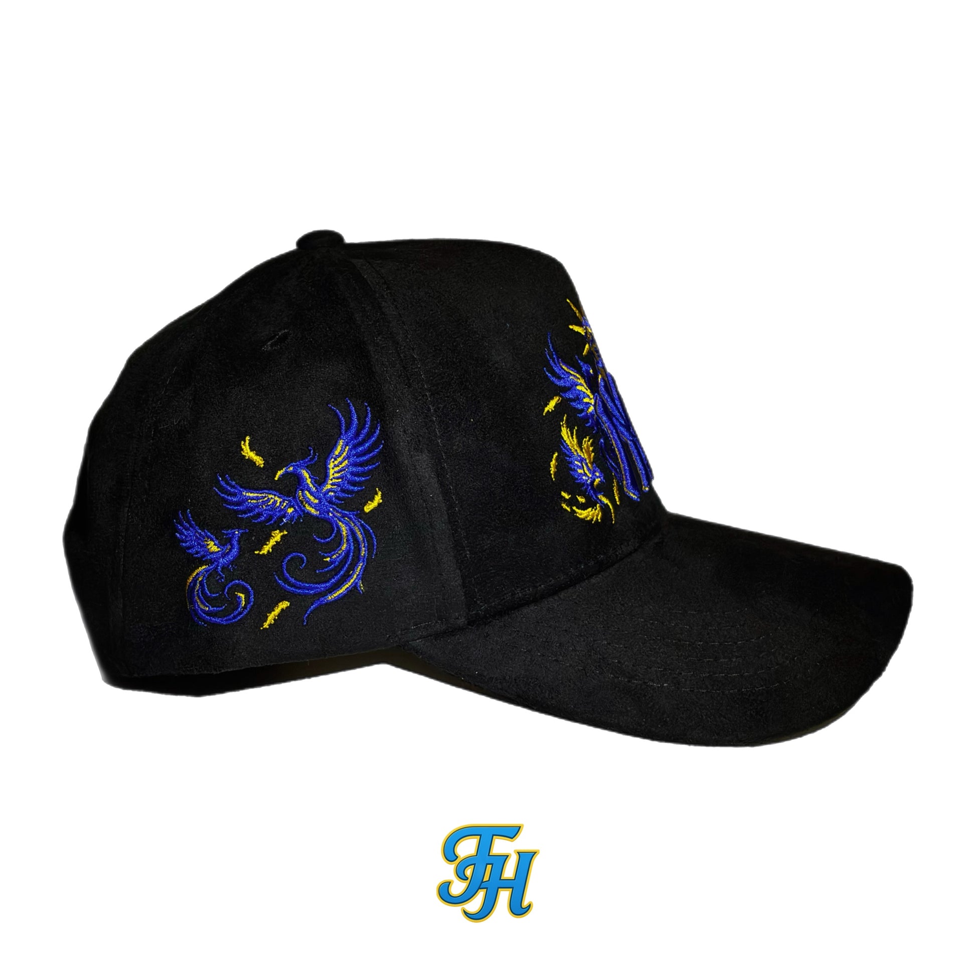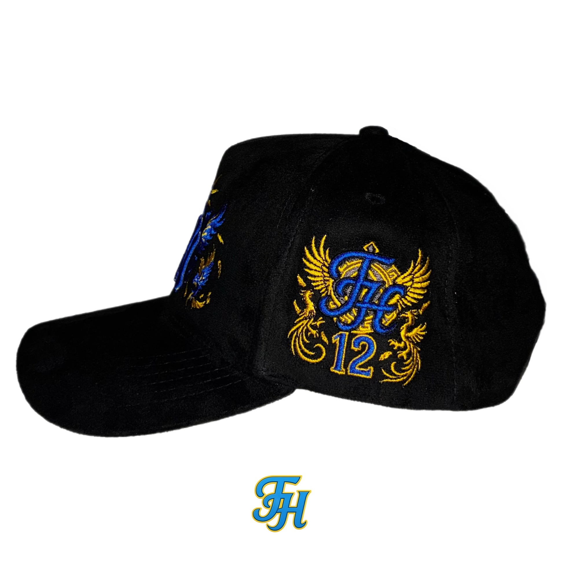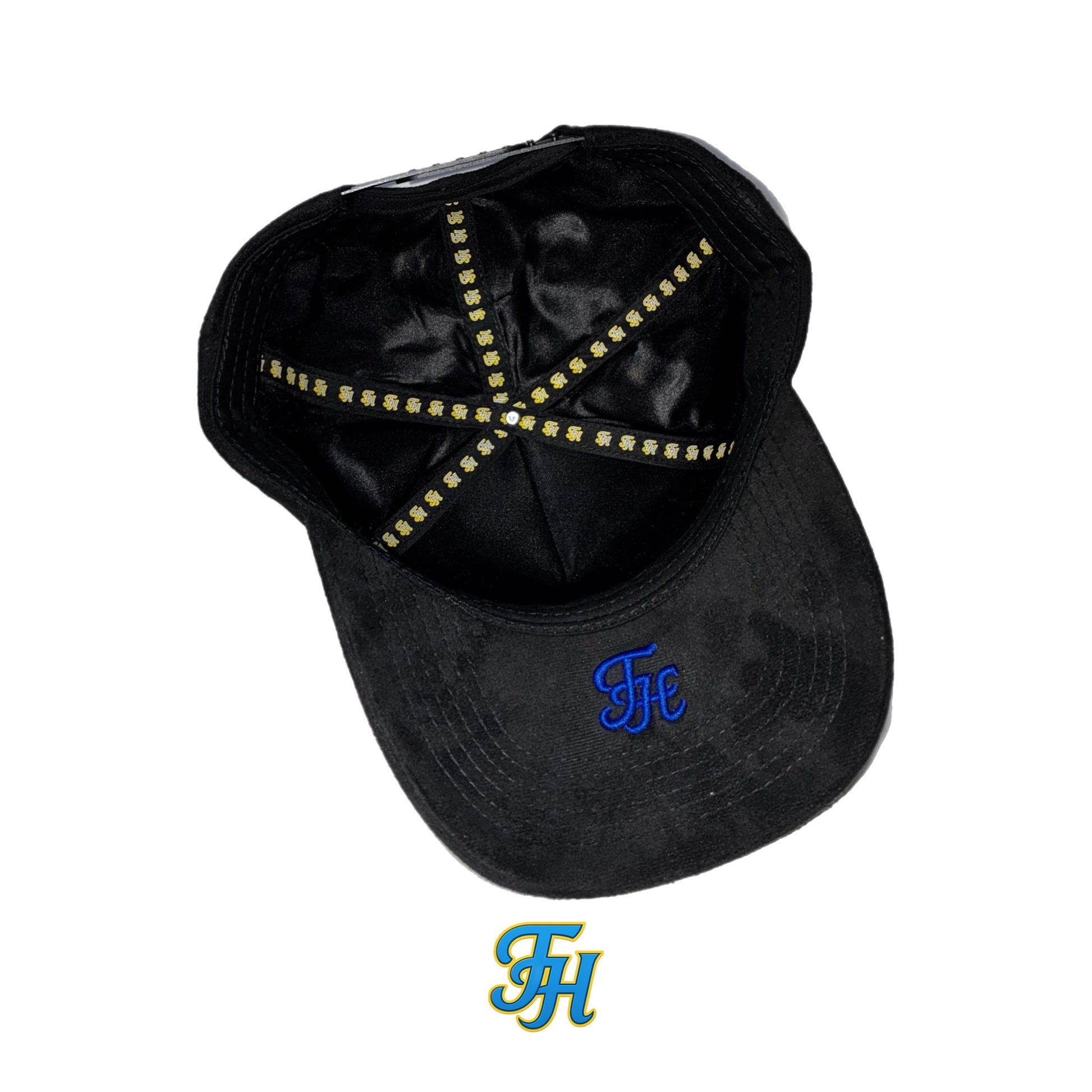 Confeccionada totalmente en gamuza premium, con interior de la corona en satín de alta calidad, que aporta un toque de lujo y suavidad al contacto con la piel. Sus bordados detallados en tonos dorados y azules destacan el carácter exclusivo de la pieza, fusionando lujo y streetwear.